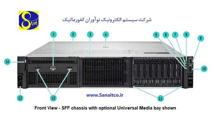 در ادامه مطلب جهت آشنایی با شکل ظاهری سرور، دو تصویر زیر که نمای جلوی سرور HP مدل HPE ProLiant DL380 Gen11 و تمامی قطعاتی که در این قسمت ها به کار رفته اند (در فرم فکتورهای SFF و LFF) را مشاهده نمایید.